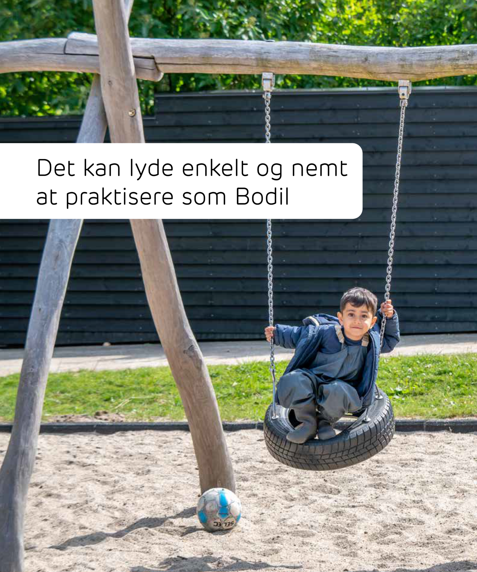 Signe begynder at gå lidt omkring, hun holder godt fast i Bodils hånd, Bodil følger med uden at sige noget. Signe stopper ved kassen med de vilde dyr. Bodil sætter sig på hug, Signe ser på Bodil og siger: ”Vil du være med til at lege med dyrene.” Bodil holder øjenkontakten, smiler og siger: ”Det vil jeg rigtig gerne.” Sammen bærer de kassen hen til legetæppet, hvor legen starter. Der går ikke lang tid, så er Signe optaget af legen, hun pludrer glad og flere børn kommer med i legen. Bodil er med i legen, hun lader børnene styre legen, stiller ikke spørgsmål, men kommenterer engageret på børnenes snakke om dyrene. Bodil er en dygtig pædagog, der bevidst arbejder med institutionens børnesyn: Alle børn skal ses, høres og inddrages.