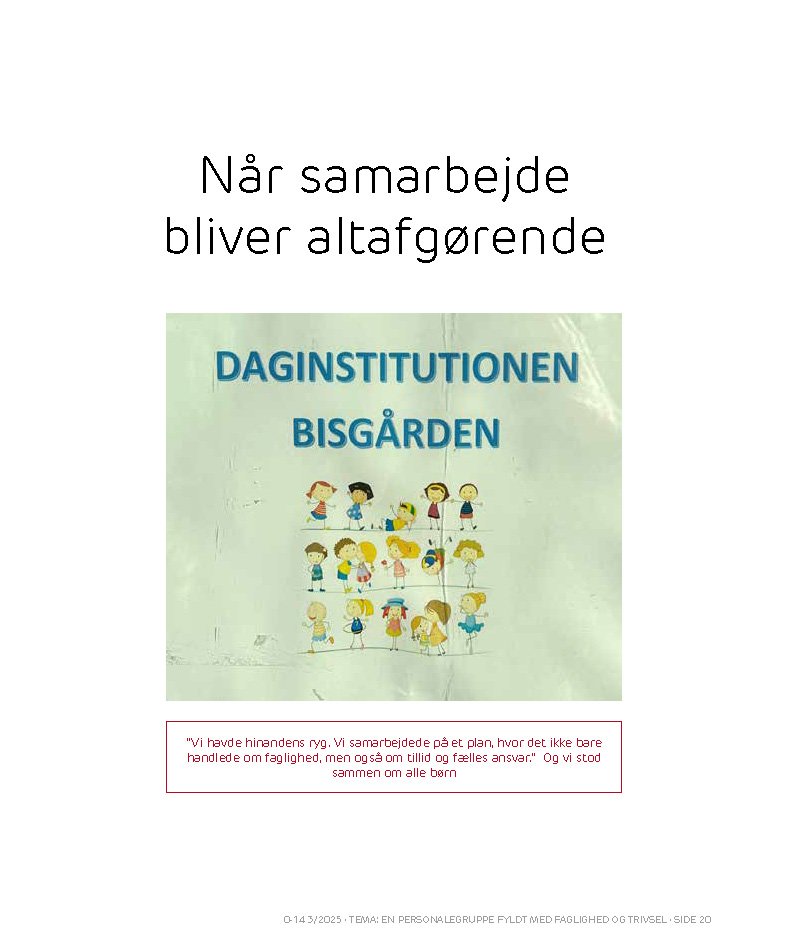 Når samarbejde bliver altafgørende af Jan Pædagogiskforum 15. januar 2026 Kommunikation, Kommunikation og samarbejde, Ledelse, Lederen og personalet, Nyeste artikler, Personale, Personalemøde, Teamsamarbejde 12 Uddrag: ”Vi har på et tidspunkt en dreng i huset, som er fysisk udfordrende og meget udfordret i forhold til børnefællesskaber. Vi starter ’i den blide ende’. At sætte sig tæt ind til ham og at der er en voksen der kan understøtte hans leg... Hele artiklen er tilgængelig for vores medlemmer. BLIV MEDLEM 0 Tags:4/2025
