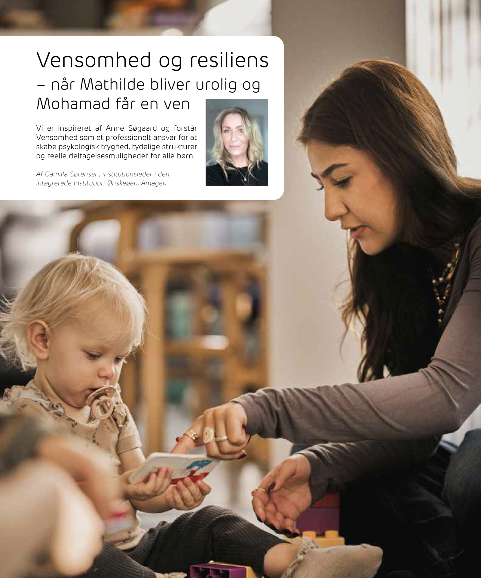 Uddrag: I Ønskeøen møder vi børn med forskellige forudsætninger, temperamenter og behov. Børn med udfordringer forstås som en heterogen gruppe, hvor vanskeligheder opstår i samspillet mellem barnets individuelle forudsætninger og de sociale og kulturelle kontekster, barnet indgår i. Med afsæt i Dion Sommers udviklingspsykologiske resiliensforståelse betragter vi trivsel, udvikling og robusthed som relationelt og miljøbetinget forankrede processer. Vi forstår ikke resiliens som en individuel egenskab, men som noget, der udvikles gennem stabile, forudsigelige rammer og kvalificerede relationer, som det pædagogiske personale har et professionelt ansvar for at etablere...
